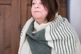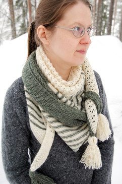 An easy-to-memorize lace pattern in one color and intarsia stripes in two colors play off of each other on two sides of the central spine. The arrow shape is completed with a garter-stitch triangle made in the accent color. A tassel is added to each corner of the shawl.