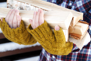 Hibernia Mitts are knit in the round from the cuff up. An ornate cable on the back of the hand flows seamlessly from the cuff and into the top ribbing. The mitts feature a gusseted, reverse-stockinette thumb to match the plain reverse-stockinette palm. These quick-to-knit fingerless mitts come in two sizes and can be worked two-at-a-time.