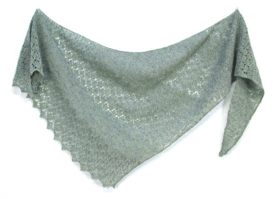 The shawl is framed by built-in i-cord edges and finished with an elastic bind-off, blocked into a scalloped edge. The pattern for Wintermint Shawl comes in two sizes.