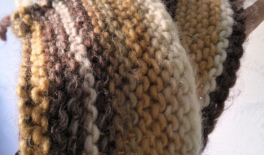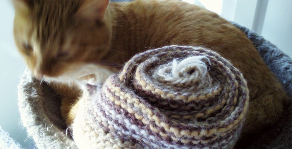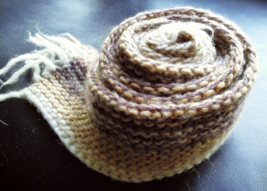 Notes: Cast on 200 stitches, knitted in garter stitch until I ran out of yarn. Made fringe with the remaining scraps. Super easy and fast!