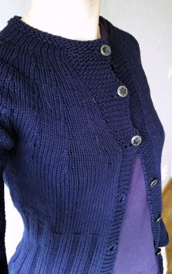 Mods: Worked sleeves seamlessly from the cuff up, joined together with the body and knitted the rest of the way seamlessly as a circular yoke. And added some waist shaping.