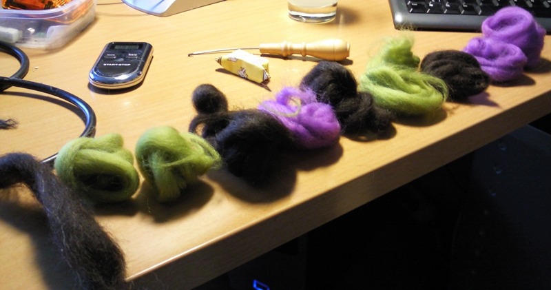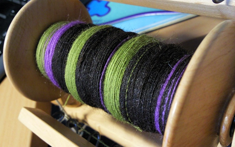 I had 100 g of dark brown wool top and 50 g each of green and purple. I tore the tops into small strips about the length of an arm, divided them into three piles of about equal weight, and spun them in the order brown-purple-brown-green-brown etc. Spun the singles onto three bobbins to make 3-ply yarn.